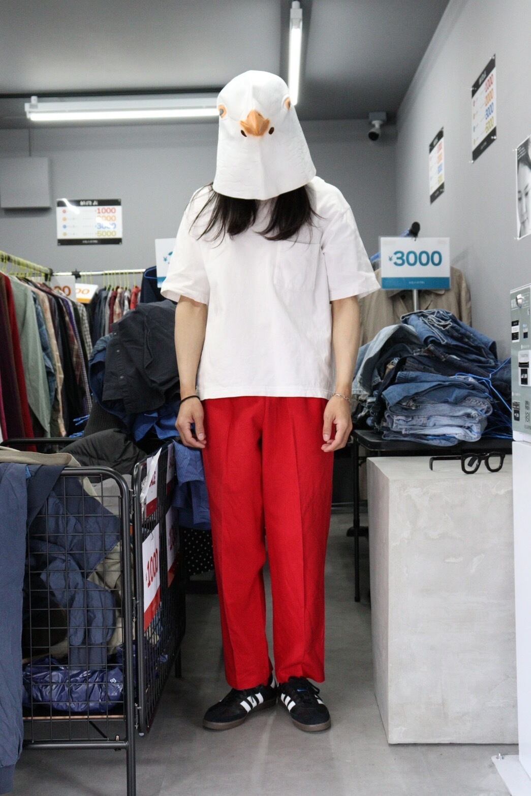 赤いジョガーパンツ。重たいカラーリングの冬コーディネートのハズしにオススメのライトな一本。